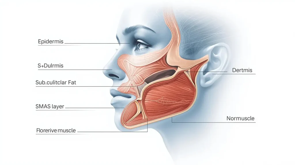 ชั้น SMAS คือโครงสร้างพังผืดที่เชื่อมต่อกับกล้ามเนื้อใบหน้า ทำหน้าที่เสมือน “โครงร่างพยุง” ของเนื้อเยื่อด้านบน ไม่ได้เป็นเพียงผิวหนัง แต่เป็นโครงสร้างที่มีความสำคัญต่อรูปทรงโดยรวม