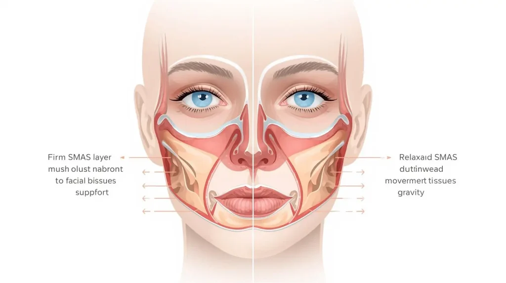เมื่ออายุเพิ่มขึ้น ชั้น SMAS จะค่อย ๆ สูญเสียความตึง และเกิดการคลายตัว ส่งผลให้เนื้อเยื่อด้านบน เช่น ไขมันและผิวหนัง ที่เคลื่อนต่ำลง ทำให้เกิดร่องแก้ม กรอบหน้าไม่ชัด และแนวกรามหย่อน