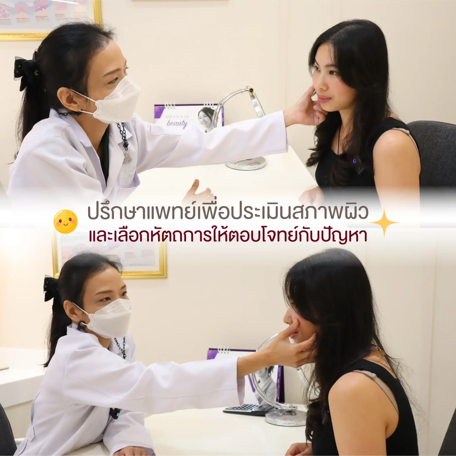 ก่อนเริ่มจะมีคุณหมอช่วยประเมินสภาพผิวอย่างละเอียดมาก ว่าผิวเราแห้งตรงไหน ขาดน้ำระดับไหน แล้วควรบำรุงแบบไหนถึงจะตอบโจทย์ ไม่ได้ทำแบบสำเร็จรูปเลย ตรงนี้รู้สึกประทับใจมากค่ะ